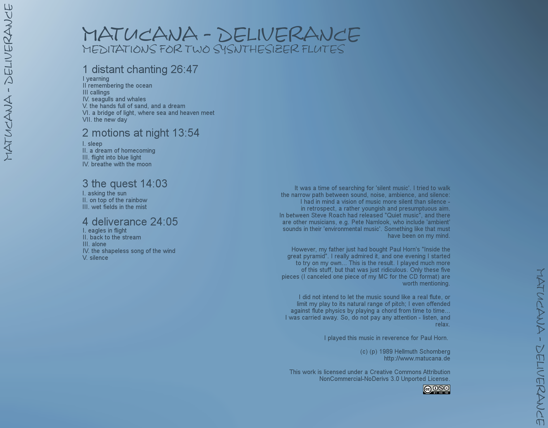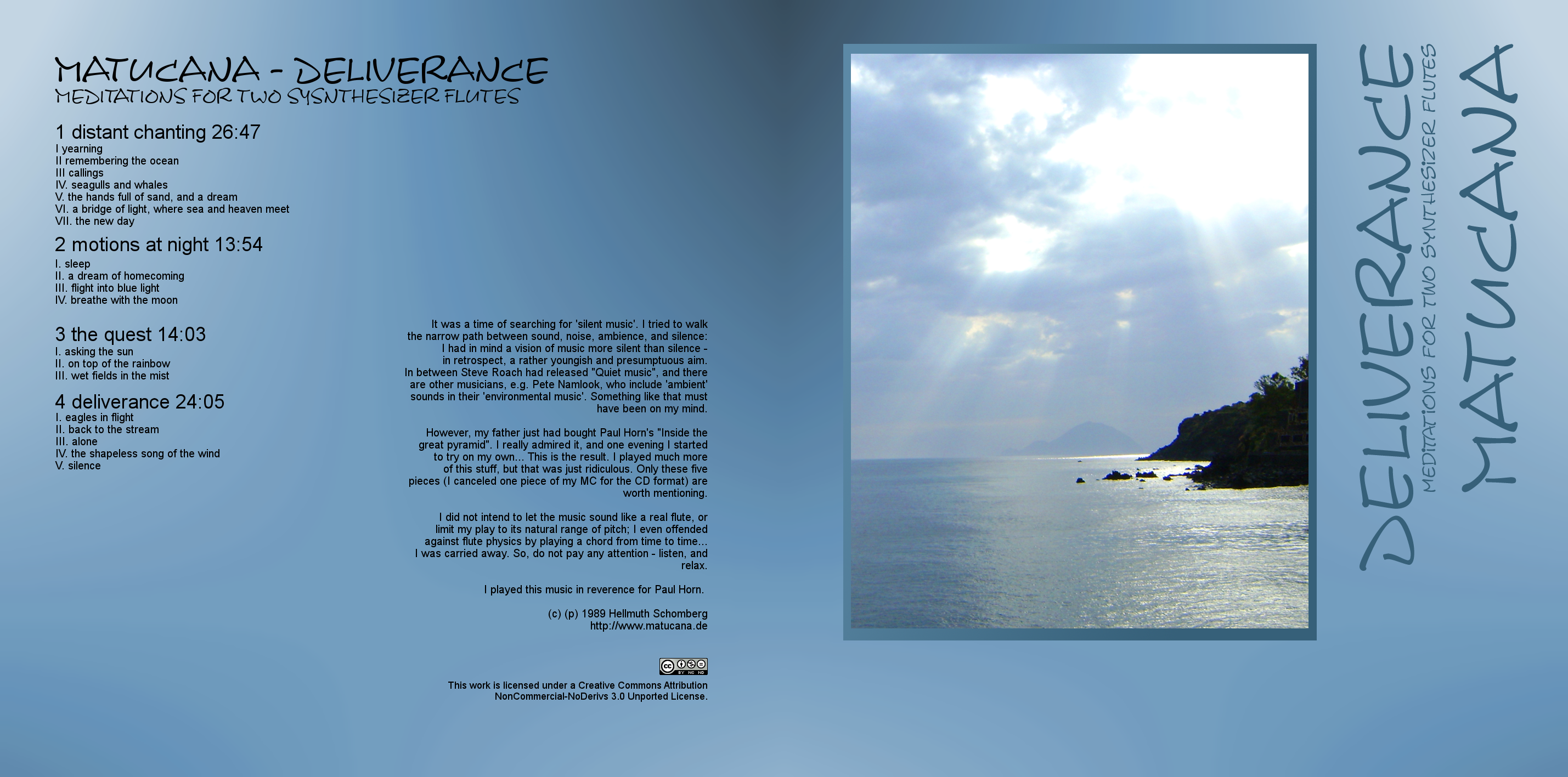Dies ist - zeitlich gesehen - meine erste Musik, die ein Veröffentlichen wert ist. Es war eine Zeit des Suchens nach 'stiller Musik'. Ich versuchte, den schmalen Pfad zwischen Klängen, Lärm, Geräuschen und Stille zu erkunden: Ich hatte eine Vision von Musik, die stiller ist als die Stille - heute, 1995, erscheint mir das naiv und anmaßend. Inzwischen gibt es Veröffentlichungen wie 'Quiet music' von Steve Roach, und andere Musiker (Z. B. Pete Namlook) benutzen 'ambiente' Klänge in ihrer "environmental music". So etwas muss mir auch vorgeschwebt haben.